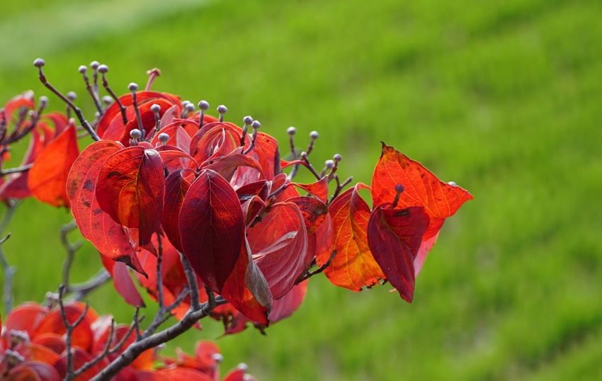 少しづつ朝晩の気温が下がって、ハナミズキの紅葉が始まりました。枝の先には来春の花の蕾も準備されています。